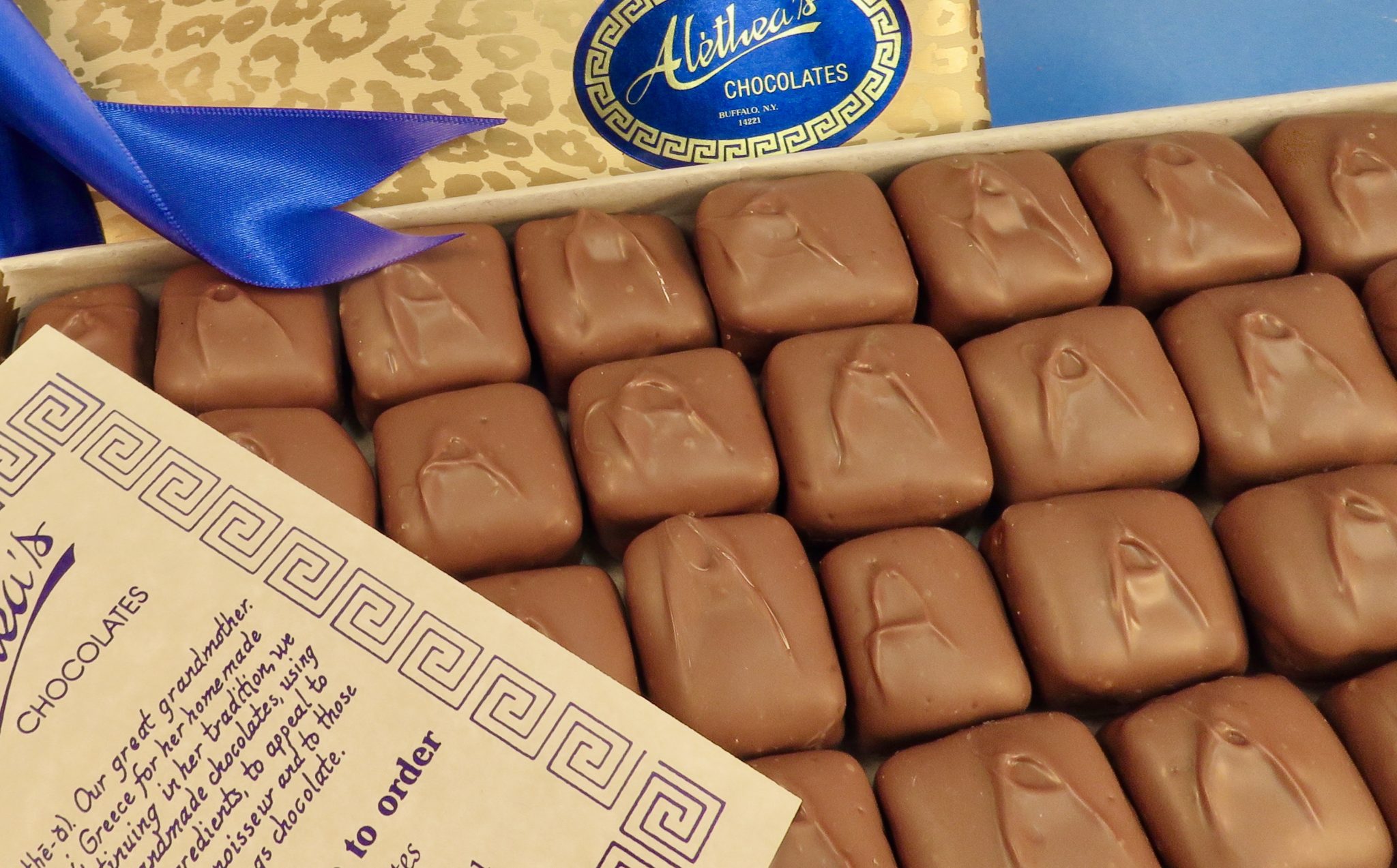Alethea’s legendary Sponge Candy.  Each piece is “branded” with the Alethea “A” so that you can be assured it’s the very best.   We’ve changed the packaging on this gift, using a sturdier box with more room for more Sponge Candy…. and who doesn’t want more Sponge Candy!  Wrapped in stellar blue/gold foil, and banded in gold satin, this ONE and a HALF pound box, makes your gift of our authentic hand made Sponge Candy absolutely perfect.    Our JMElite Sponge Candy Gift is available Now through Mother’s Day.
