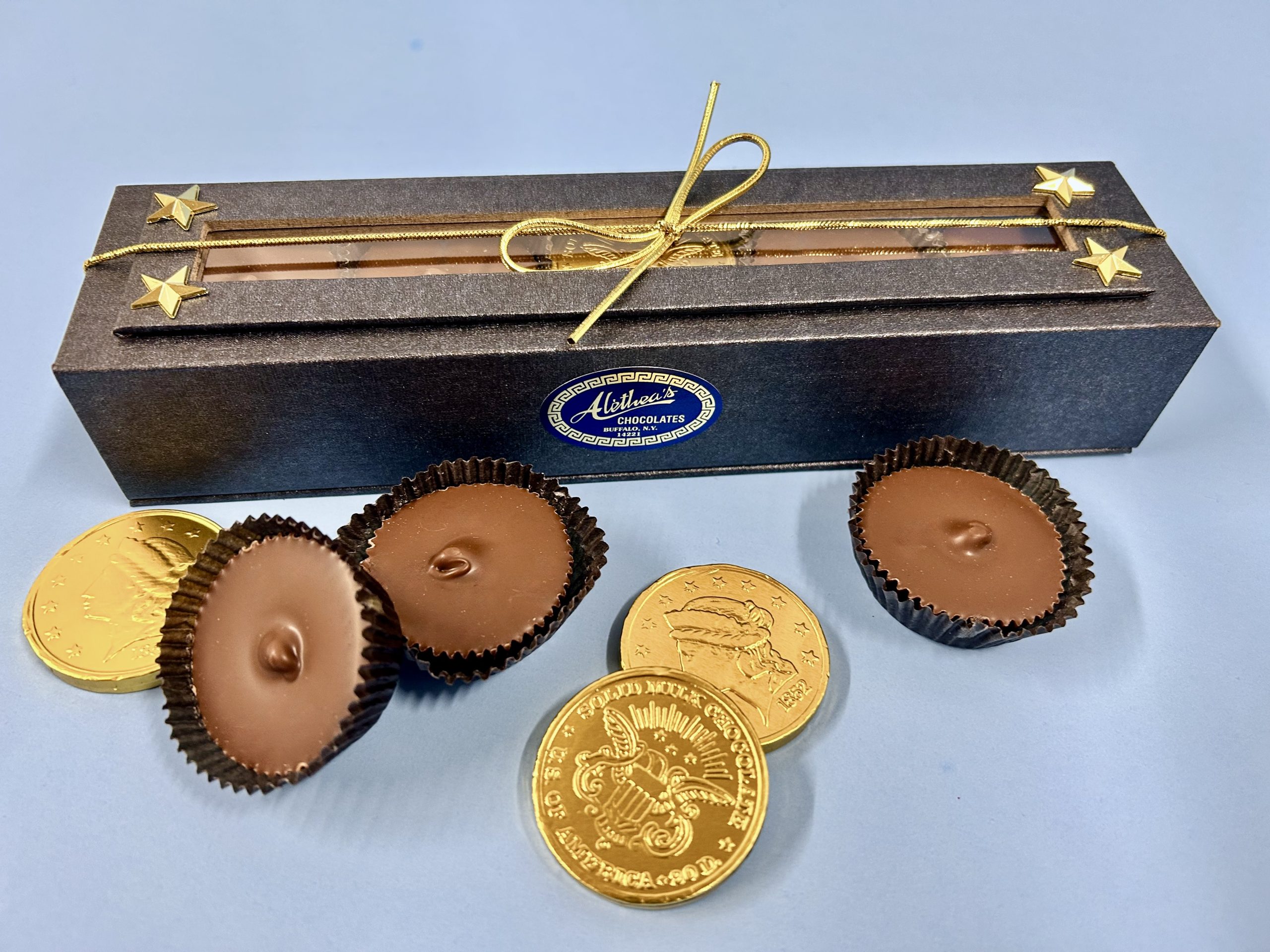 For that person who just can’t get enough of our Peanut Butter Cups! This handsome, navy blue, magnetic close gift box includes NINE of our tasty milk chocolate Peanut Butter Cups and a few Foiled Chocolate Gold Coins, to make it extra fabulous! Your welcome.