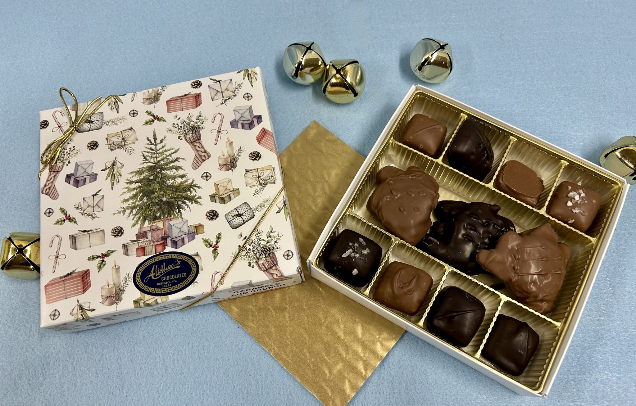 This Charming Holiday Box, created for all of our Caramel and Crunch lovers, includes our fabulous Pecan Purtles, Caramels, Pecan Toffee and more! A milk and dark collection.