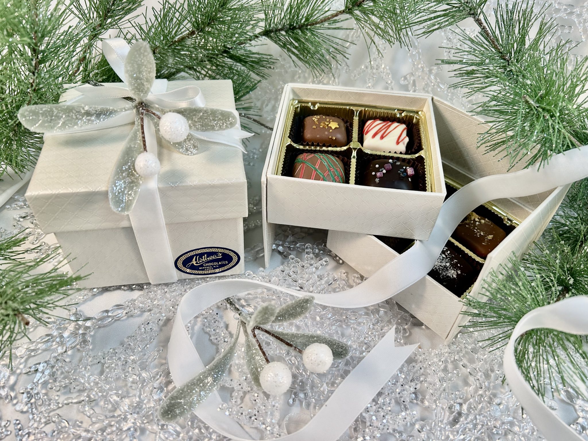 Our redesigned Tia Truffles from JMElite Gifts now has more Truffles! This Holiday Edition is beautifully presented in an elegant two tiered white pearl box with magnetic closure, tied with white velvet and embellished with sparkling mistletoe. Elegant and festive.