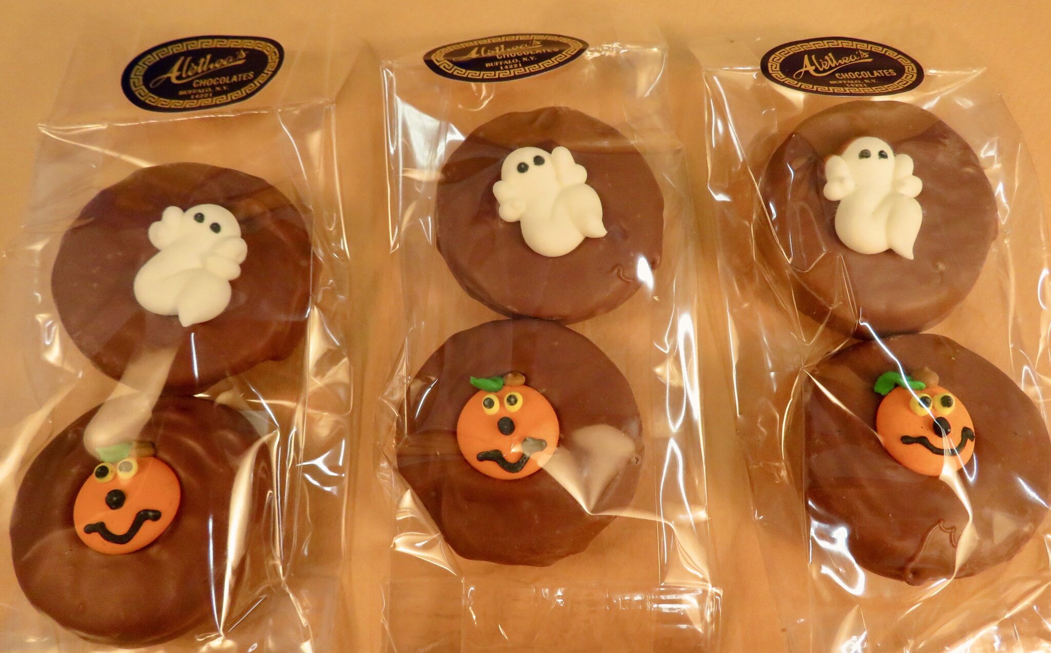 Oreo Cookies, drenched in Alethea’s own creamy, gourmet chocolate, scarily decorated with Royal Icing and wrapped in a convenient 2 pack .  Perfect for Trick or Treat!