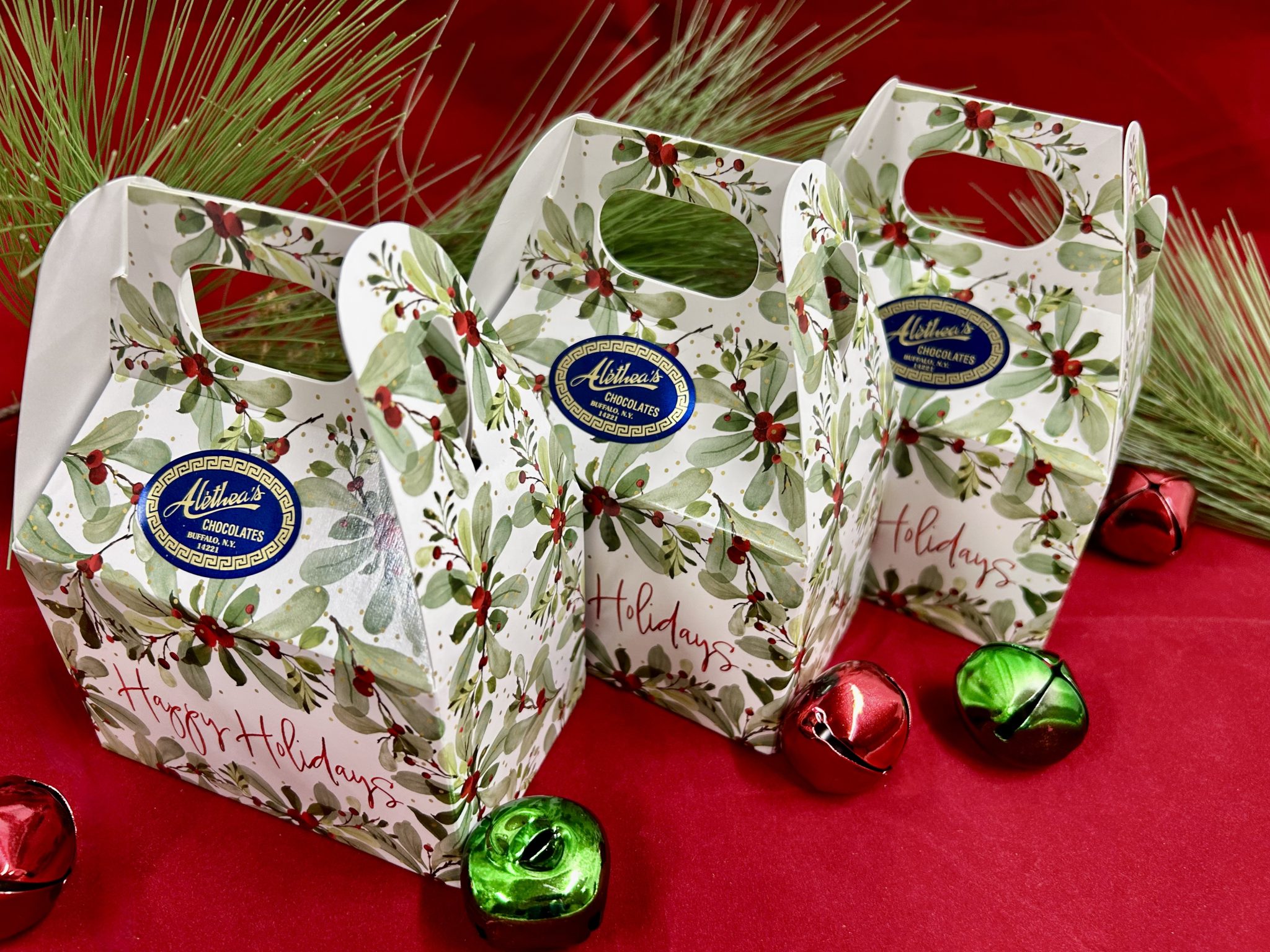 Alethea’s solid, milk chocolate Holiday Bells, brightly foiled and packaged in a festive Happy Holidays handle box.