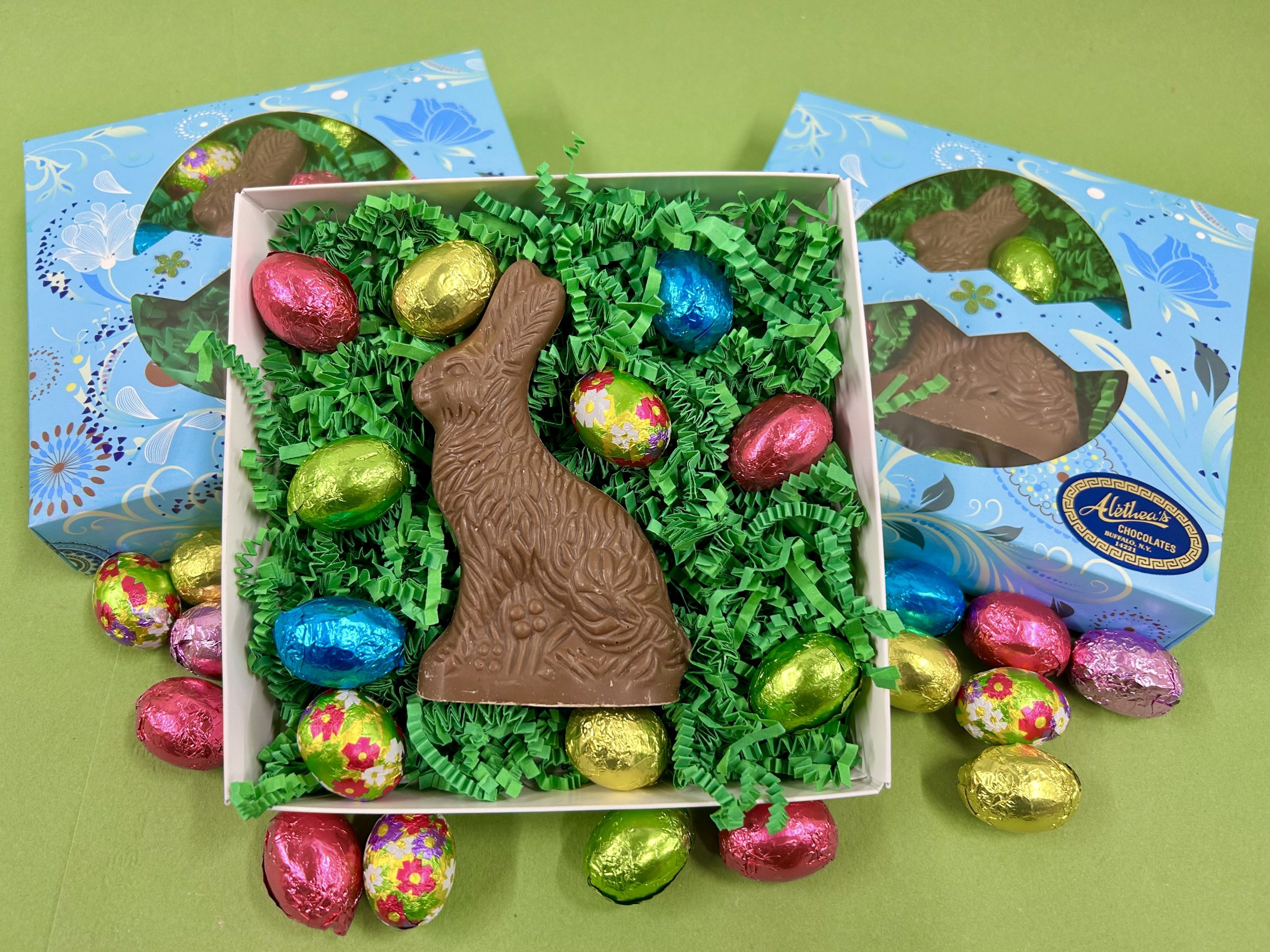 Our charming solid milk chocolate bunny is bordered by colorful foiled milk Chocolate Eggs.  Presentation ready in a festive Easter egg window box.