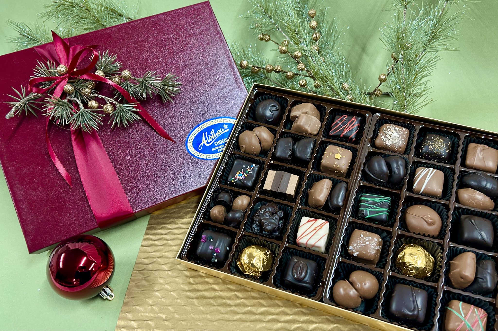 Our big, beautiful, overstuffed box …. 20 oz.perfectly selected from our finest confections….chocolates, truffles, nuts, creams, caramels, cordials…all of the best, for the best.  Artfully displayed in a beautiful sherry and gold box, exquisitely decorated for the Holidays.  An exceptional gift, that will be remembered.