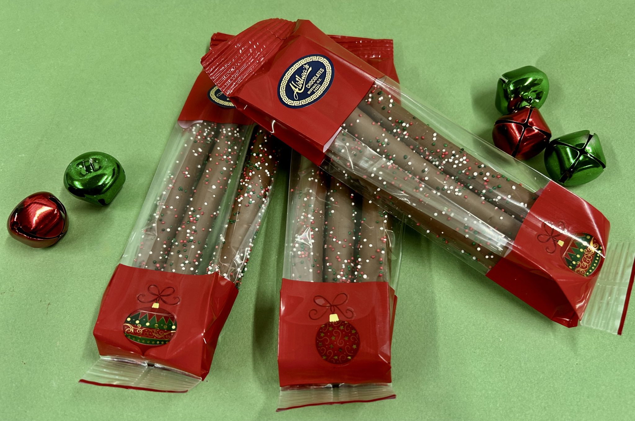 A favorite anytime, 3 of our premium Chocolate Pretzel Rods, sprinkled with confetti and festively packaged for the Holidays. Makes a great stocking stuffer!