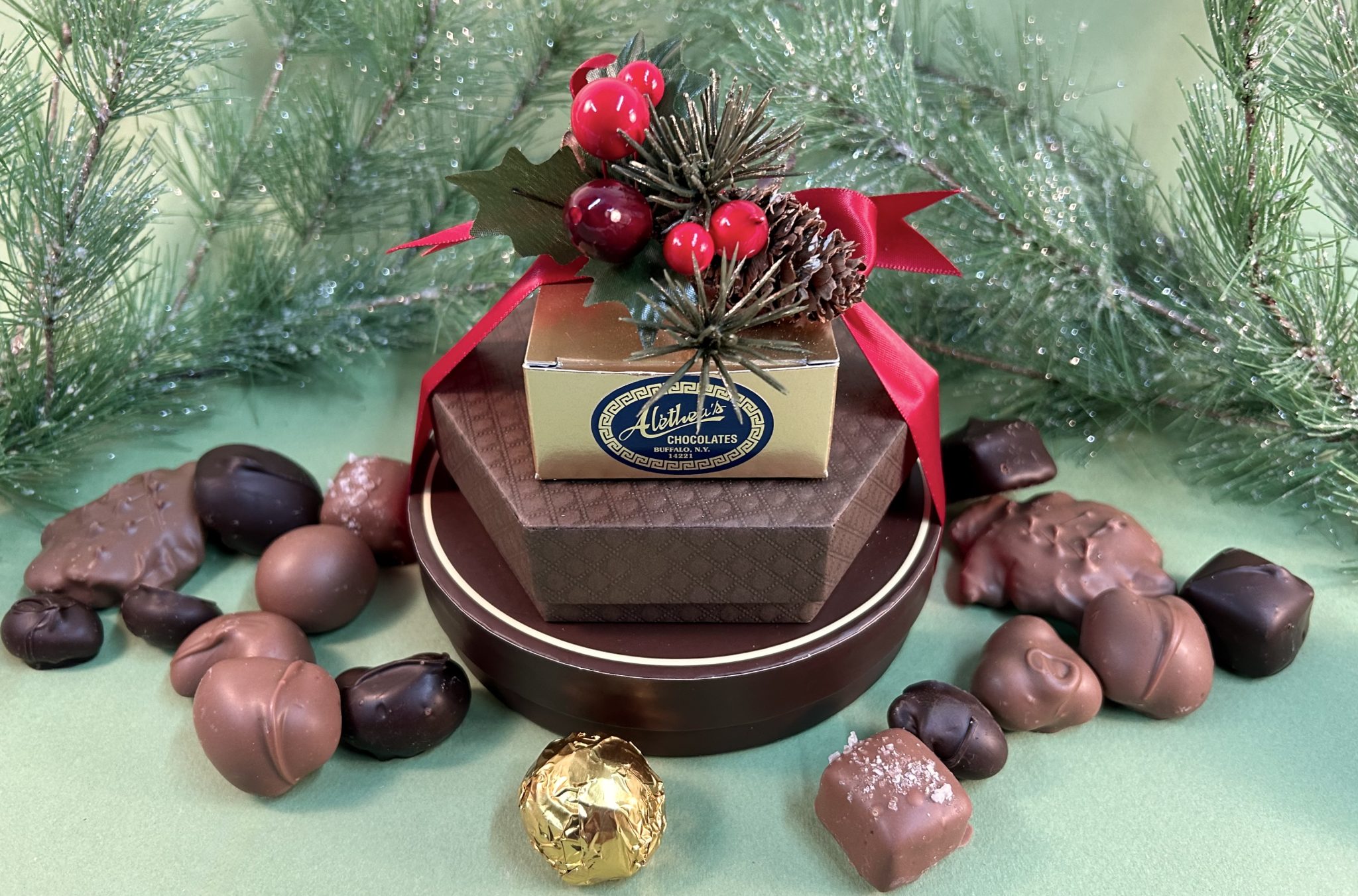 This handsome mini tower holds a sampling of many of our most popular confections. Pecan Purtles, buttery Caramels ( plain and sea salt ), Chocolate Nuts, Artisan Truffles and a Cherry Cordial! Presentation ready, tied with sherry satin ribbon, pine and berries for Holiday gifting.